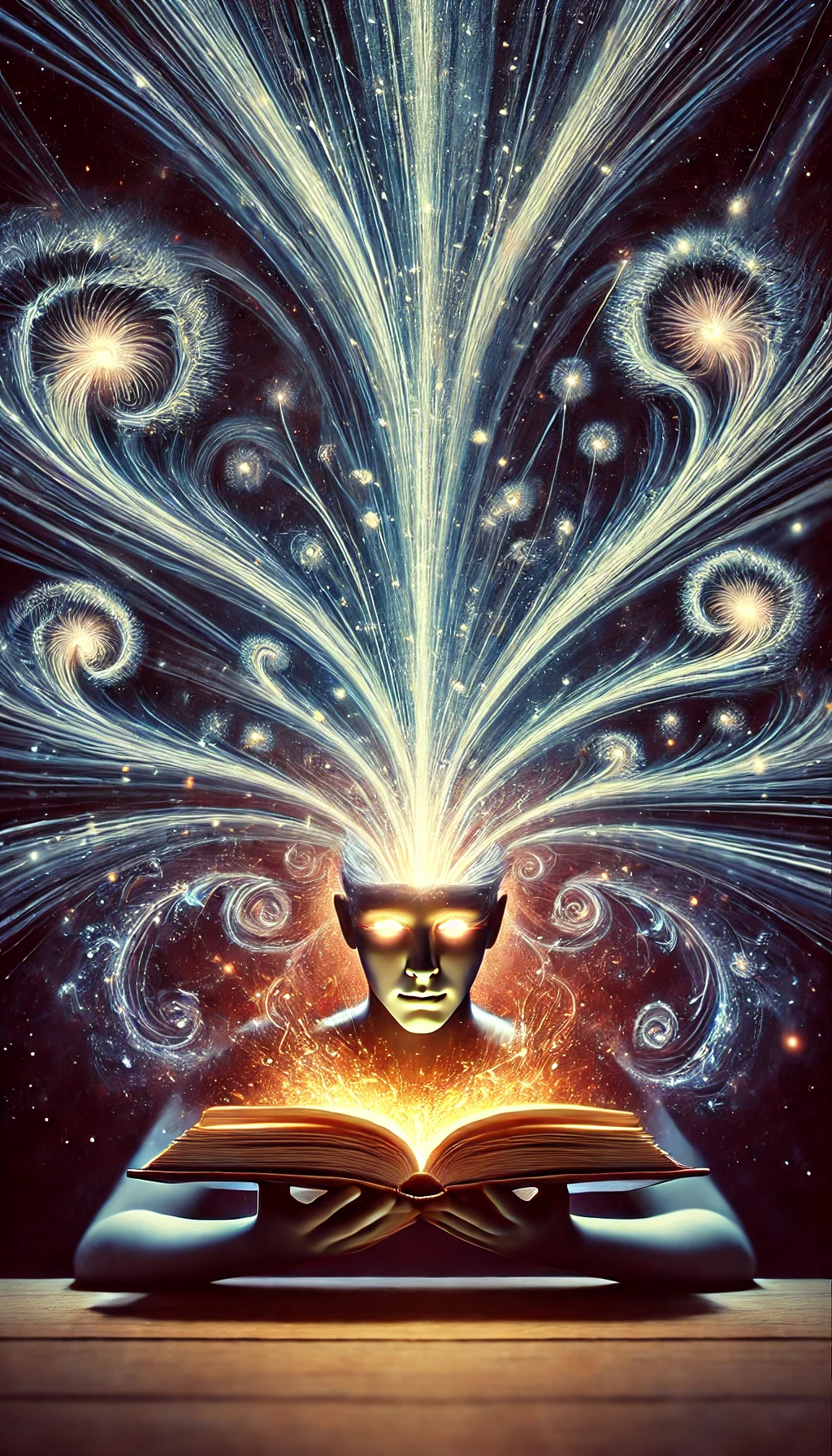 5 You Are No Longer the Reader - DALL·E 2025-03-13 09.14.45 - A surreal, long-format image depicting a person reading an open book, but instead of words, swirling patterns of light and energy rise from the pages .webp