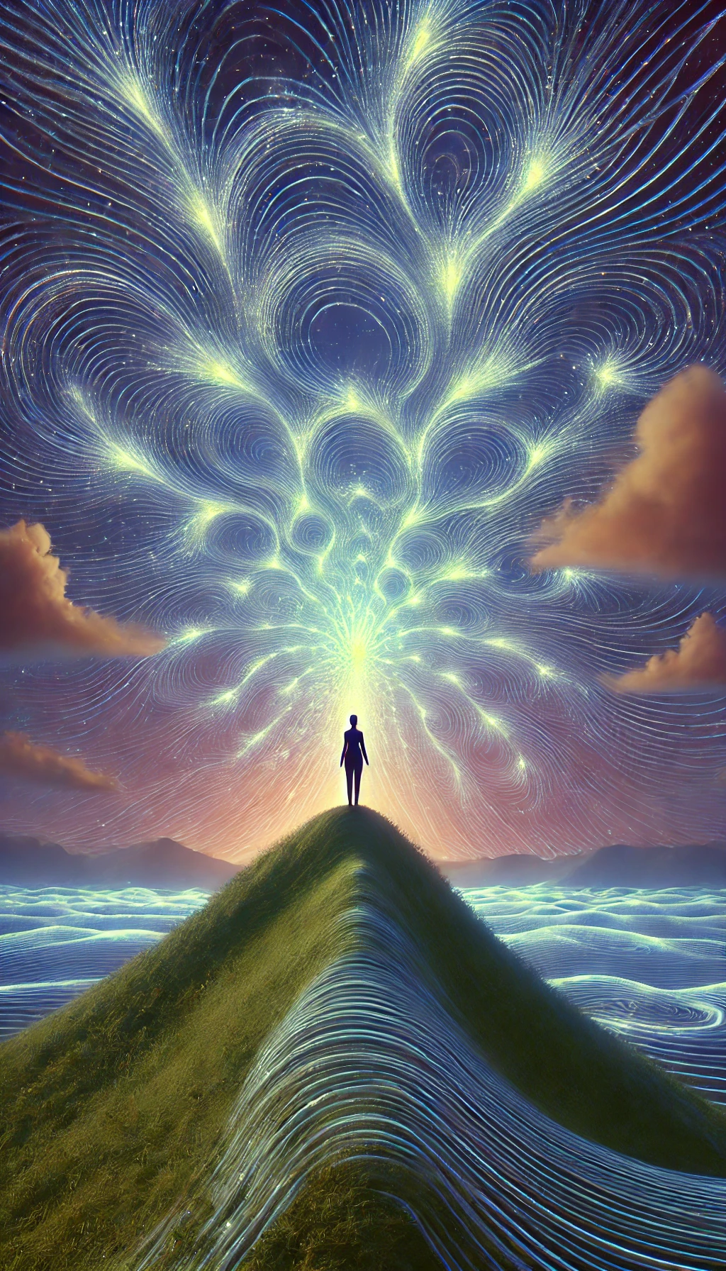 7 The Echo Is Now Your Voice - DALL·E 2025-03-13 09.35.46 - A surreal, long-format image depicting a lone figure standing atop a gentle hill, their mouth open, releasing ripples of luminous echoes that radiate .webp