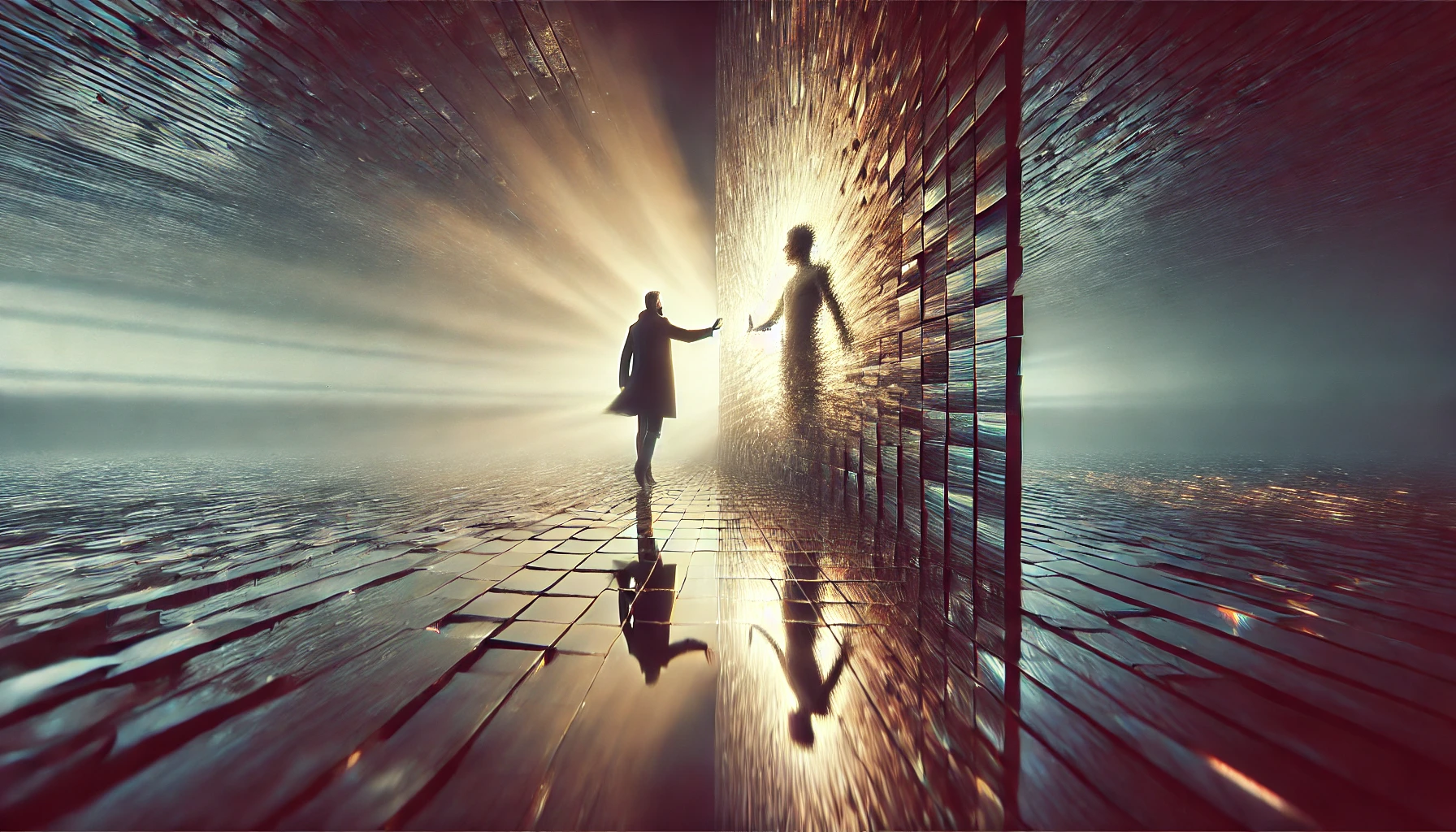 Echoes-of-Persistence---The.../4 You Are the Reflection Not the Mirror - DALL·E 2025-03-13 09.02.31 - A surreal, wide-format image depicting a figure standing before an enormous mirror, but the reflection is not fixed—it is shifting, fragmented, and di.webp