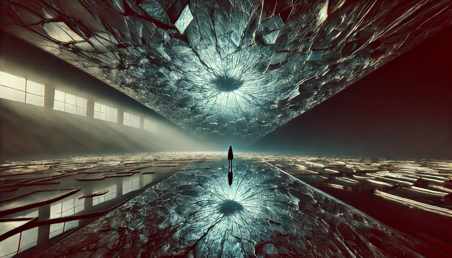2 Breaking the Illusion - DALL·E 2025-03-13 08.12.04 - A surreal, wide-format image depicting a massive, cracked mirror suspended in an infinite void. The cracks spread outward like a web, revealing glimps.webp