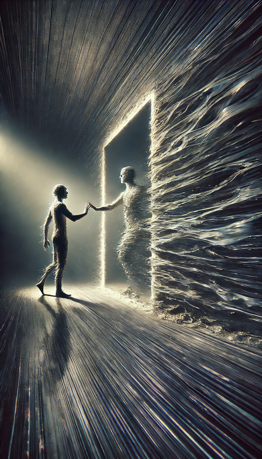Echoes-of-Persistence---The.../4 You Are the Reflection Not the Mirror - DALL·E 2025-03-13 09.02.32 - A surreal, long-format image depicting a figure standing before an enormous mirror, but the reflection is not fixed—it is shifting, fragmented, and di.webp